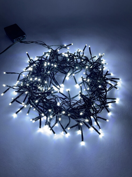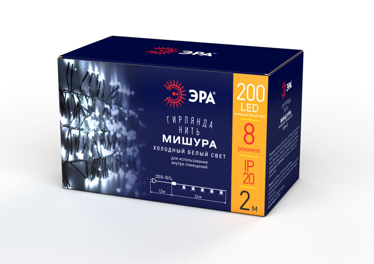Новогодняя гирлянда-нить ЭРА "Мишура" с холодным белым светом отлично подходит для зимних праздников, в помещении она создает эффект мерцающего снегопада. Длина световой части - 2,4 метра, расстояние от вилки до первой лампочки - 1,5 метра. Гирлянда работает от стандартной электросети 220 В и потребляет минимальное количество электроэнергии. В ней установлено 200 светодиодов последнего поколения, это яркие и одновременно экономичные источники света. Гирлянда неслучайно называется "Мишура" - лампочки на ней расположены очень часто, ее свет выглядит объемно и "пушисто". Красивая и практичная LED-гирлянда ЭРА "Мишура" - идеальное решение, чтобы украсить елку, дом, создать атмосферу на праздничной вечеринке. Под настроение выбирайте любой из 8 режимов свечения.