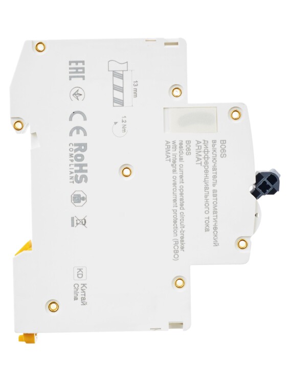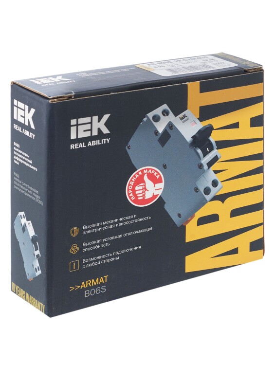 Автоматические выключатели д ифференциального тока (АВДТ) ARMAT серии B06S могут осуществляют функции защиты от токов перегрузки и короткого замыкания и защиты человека от токов замыкания на землю. Модельный ряд включает в себя устройства с номинальными токами от 6 до 32 А, характеристиками срабатывания по сверхтоку B и C, типами защит AC и A с номинальным дифференциальным током отключения 30 мА. Номинальная отключающая способность АВДТ ARMAT серии B06S составляет 6 кА.