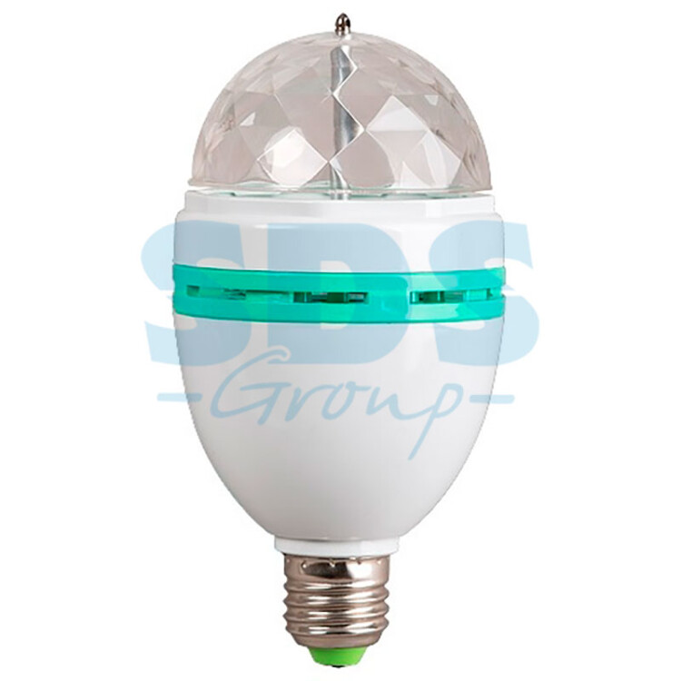 Диско-лампа с цоколем E27 — компактное уст ройство, которое способно создать атмосферу праздника и веселья где угодно: в квартире, на даче, в офисе или кафе. Интерьерный декор с функцией светомузыки работает от напряжения 230 Вольт: изделие можно вкрутить в подходящий по параметру патрон или установить в специальную подставку с электрическим кабелем и вилкой. Изделие выполнено в виде традиционной лампочки из белого пластика. Прозрачный купол, под которым находятся 3 диода RGB, вращается, отбрасывая разноцветные блики. Диско-лампа — это повод для вечеринки в любом месте.