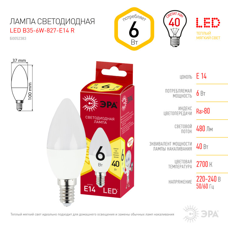 Бытовая светодиодная лампа ЭРА Бюджетной серии , создаёт яркое ровное освещение и экономит до 90% электроэнергии по сравнению с лампой накаливания с аналогичным световым потоком. Светит теплым светом с жёлтым оттенком - такая цветовая температура эффективна для отдыха и уютной атмосферы в доме. Используется в потолочных, настенных, настольных светильниках, в люстрах и бра. Мгновен но включается и не нагревается.