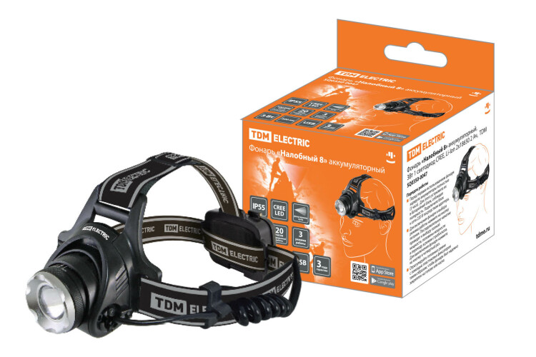 TDM Фонарь «Налобный 8» аккумуляторный, 3Вт 1 светодиод CREE, Li-Ion 2x18650 2 Ач,.