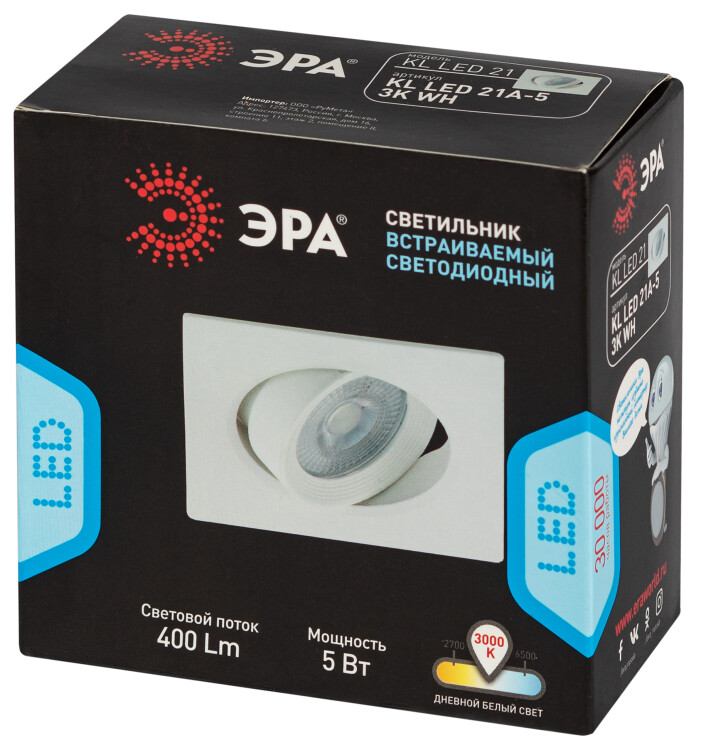 ЭРА KL LED 21A-5 3K WH Белый Светильник светодиодный квадратный поворотн. LED SMD 5W 3000K