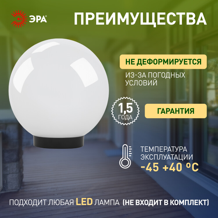 Светильник предназначен для декоративной подсветки садово-парковых зон, прогулочных дорожек, коттеджей, функционально-декоративного освещения скверов, парков и бульваров, а также для подсветки фасадов зданий, архитектурных памятников и различных строений. Дизайн с учетом европейских тенденций в освещении. Не подвержен коррозии, деформации под воздействием погодных условий. Подходит любая светодиодная лампа, имеющая габариты не более D118мм, H=«D шара»-30мм
