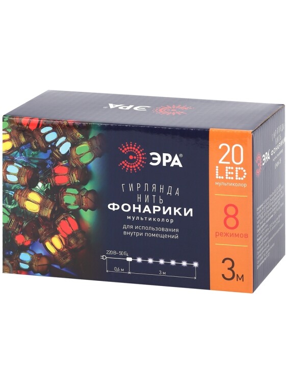 Новогодняя светодиодная гирлянда ЭРА "Фонарики" (арт. Б0041897) поможет быстро и просто украсить к праздникам дом, офис или общественное пространство. 20 ламп этой гирлянды представляют собой миниатюрные разноцветные фонарики. Внутри каждого фонарика - яркие светодиоды. Эта 3-метровая гирлянда с 8 режимами работы отлично выглядит как во включённом, так и в выключенном состоянии. Стилизованные под уличный ретро-фонарь лампочки сами по себе являются украшением пространства. По сути эта гирлянда 2 в 1: ёлочные игрушки + иллюминация. Вы можете украсить ёлку одной лишь гирляндой ЭРА "Фонарики" - и новогоднее дерево уже будет иметь нарядный завершённый вид. LED-технология минимизирует затраты на электроэнергию, используйте эту гирлянду в течение всех новогодних праздников без страха получить большие счета. Создавайте праздничное настроение вместе с ЭРА.