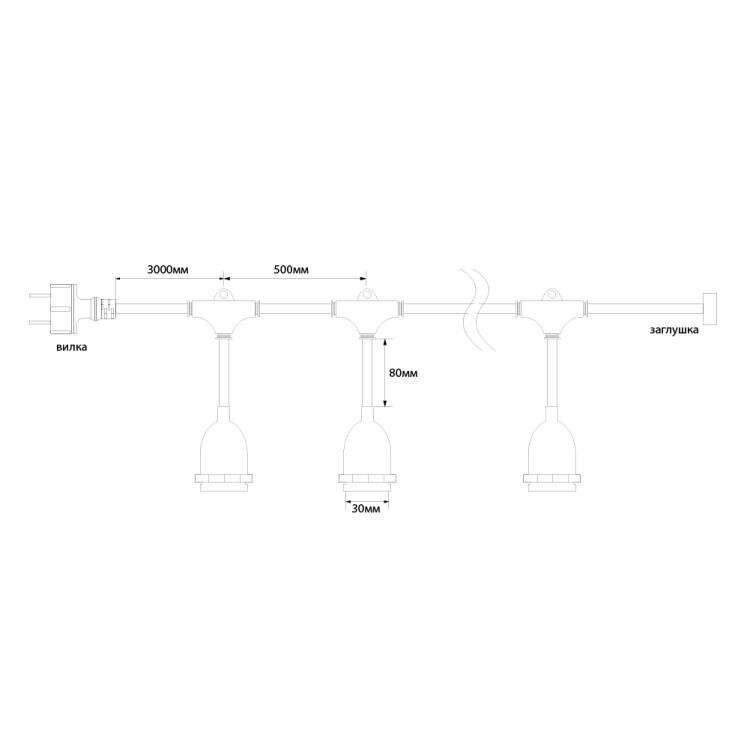 Гирлянда "Белт-лайт" FERON CL50-13, 10м+3м сетевой шнур, цвет черный, патрон E27*20, шаг 50см, 230ВV/50Гц, 16А, IP65, max 40W, сечение 2*0,5мм², материал: каучук,медь,ПВХ,латунь