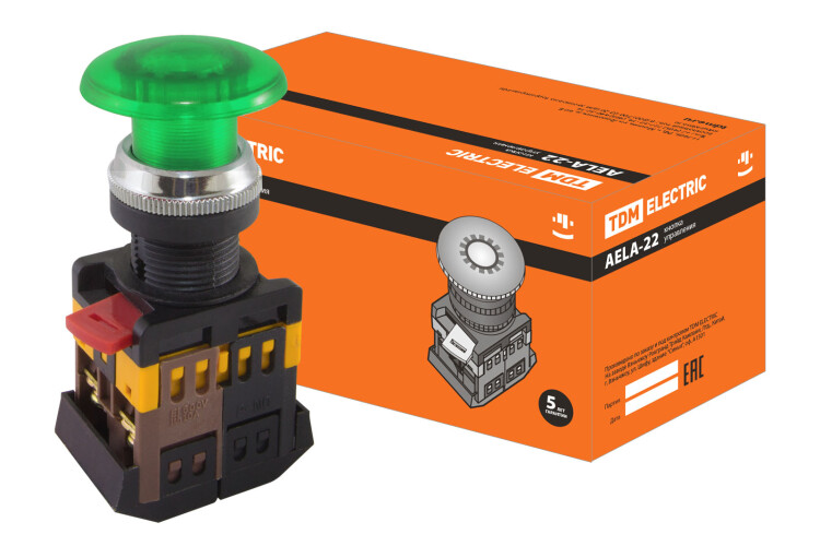 TDM Кнопка AELA-22 "Грибок" зеленый d22мм неон/230В 1з+1р