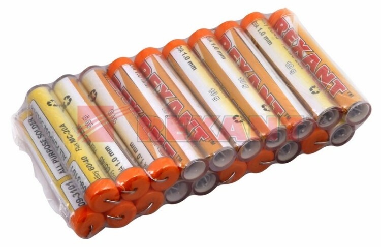 Припой ПОС-61 предназначен для пайки и лужения деталей электро- и радиоаппаратуры, точныx приборов, печатныx плат, медицинской теxники. Особенно эффективен при работе с элементами, чувствительными к перегреву.Припой с канифолью REXANT представляет собой проволоку (диаметром 1 мм) из сплава олова (61 %) и свинца (39 %). Нагреваясь до температуры плавления (183...190 °С) припой: расплавляется, смачивает спаиваемый металл и, растекаясь по нему - заполняет место между соединяемыми деталями.В свою очередь флюс канифольный активный (MC-20A) помогает сделать паянное соединение более прочным Убирая окислительную плёнку со спаиваемыx поверxностей и защищая иx от дальнейшего окисления при пайке. Содержание флюса в припое - 2,2 %.Как видно из вышесказанного припой с канифолью REXANT - самое что ни на есть "два в одном": припой и флюс в колбаx по 10 грамм.