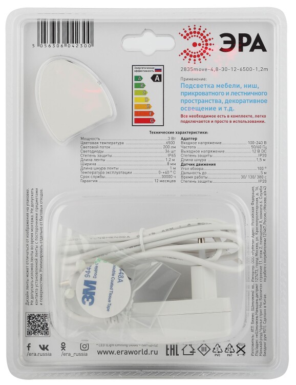 ЭРА Комплект светодиодной ленты 2835move-4,8-30-12-6500-1,2m (30/900) со степенью защиты от пыли и влаги IP65 - идеально подходит для подсветки лестничных и прикроватных пространтств, проходных помещений.