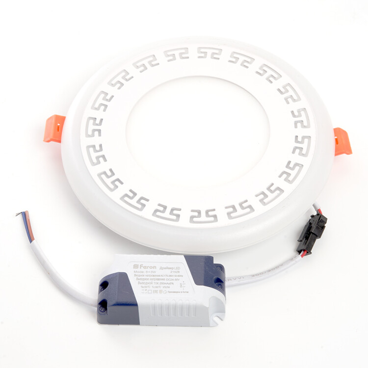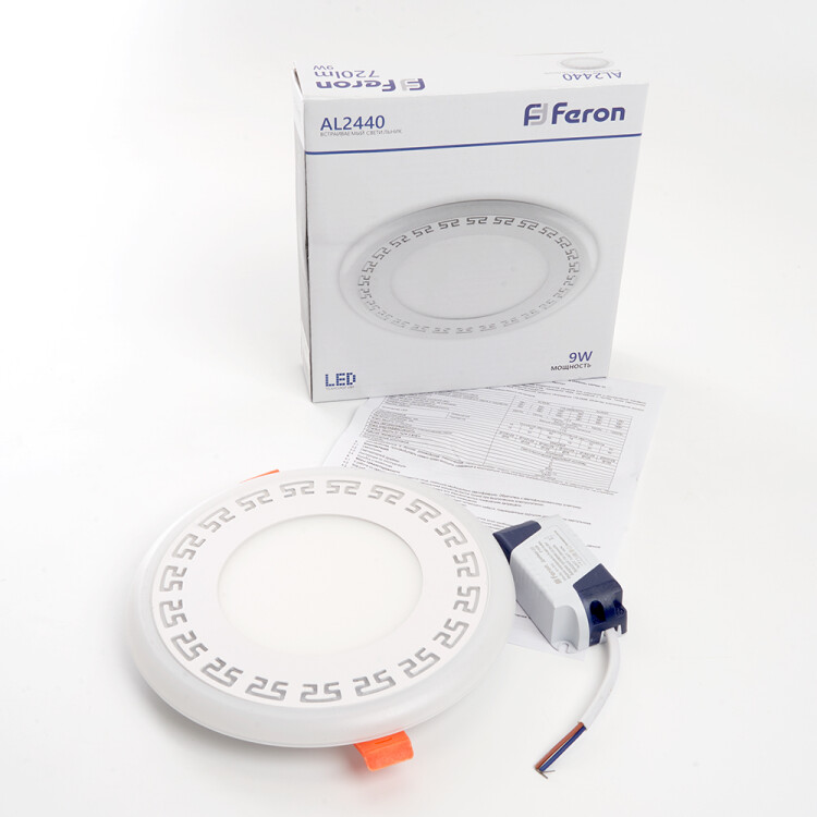 Светильник встраиваемый светодиодный, с синей LED подсветкой (ДВО) FERON AL2440, 9W 4000К (белый), 175-265V, 720Lm, IP20, угол рассеивания 120°, цвет белый, корпус алюминий, рассеиватель матовый акриловый полимер, 157*157*28.5 мм, монтажн.отв. 107*107 мм.