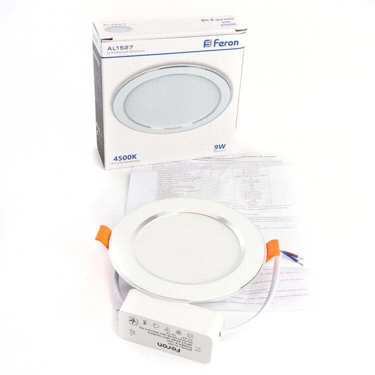 Светильник встраиваемый светодиодный, декоративный (ДВО) FERON AL1527, 9W 4500К (белый), 230V, 720Lm, IP20, угол рассеивания 120°, цвет белый, корпус алюминий, рассеиватель матовый акриловый полимер, 115*115*30 мм, монтажн.отв. 83*83 мм.
