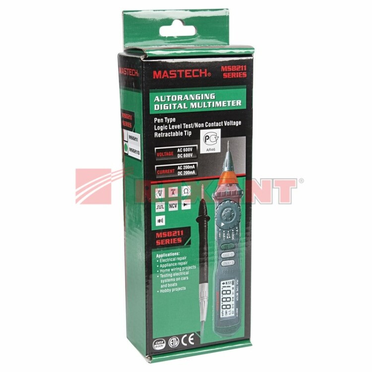 Цифровой мультиметр MASTECH MS8211D — прибор 2 в 1 - тестер напряжения и мультиметр, позволяющий измерять постоянное и переменное напряжение, постоянный и переменный ток и сопротивление. Он имеет режим «прозвонка», диод-тест. Особенность этого мультиметра заключается в двух функциях — измерение тока с защитой самовосстанавливающимся предохранителем и тест логических уровней. Мультиметр имеет звуковую и световую индикацию. Модель работает от 2 батареек 1.5 В ААА.