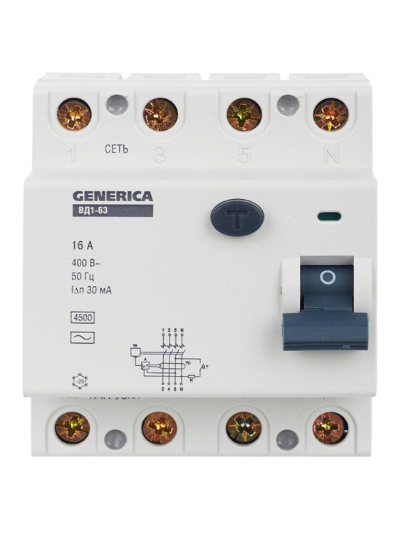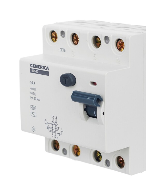 Быстродействующий защитный выключатель ВД1-63 (УЗО) GENERICA - устройство электронного типа, зависящее от напряжения и реагирующее на дифференциальный ток, без встроенной защиты от сверхтоков. Предназначен для защиты человека от поражения электрическим током.