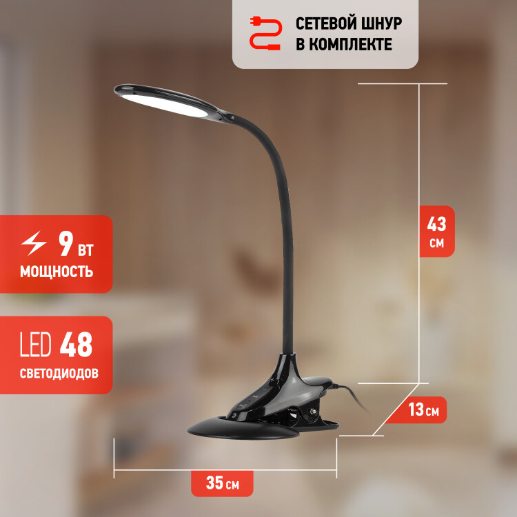 Настольный светильник "ЭРА" - светильник со светодиодами (LED) в качестве источников света, которые экономят до 90% электроэнергии и не требуют замены на протяжении всего срока службы светильника. Два варианта крепления: модель на прищепке со съемной вставкой-основанием. Может быть использована как светильник на основании и как прищепка. Сенсорный переключатель на основании. Выбор цветовой температуры - 3 цвета: 3000К, 4500К, 6000К. Пятиступенчатый диммер для регулировки яркости. Класс энергоэффективности: A. Степень защиты от воздействия окружающей среды: IP20. Диапазон рабочих температур: + 5..+40C. Класс защиты от поражения электрическим током: класс II. Количество светодиодов: 48 шт.