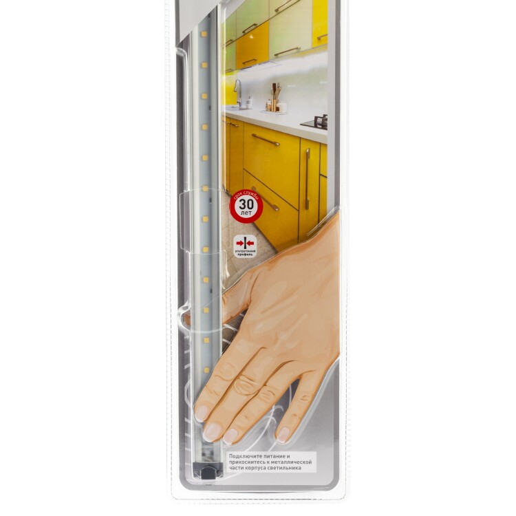 Светодиодный модуль с управлением от датчика прикосновения, мощность 5Вт. Срок службы 30000 часов. Напряжение питания 12В DC. Цветовая температура 4000K. Комплектация: светильник, источник питания, крепежные клипсы, двусторонний скотч.