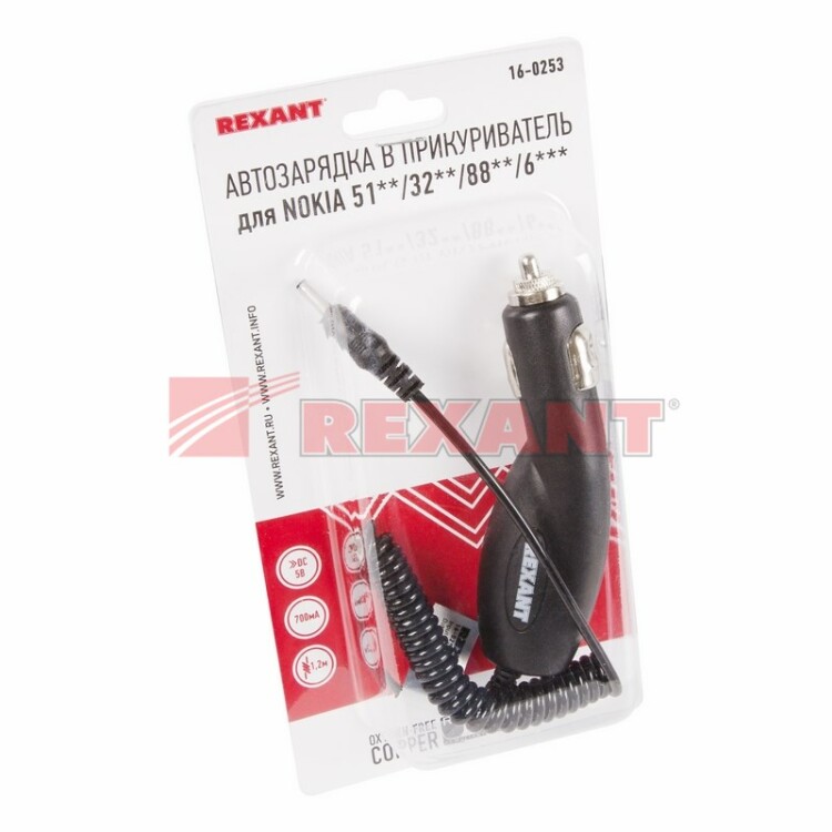 Автомобильное зарядное устройство для NOKIA 51**/32**/88**/6***Вxодное напряжение: AC 12-24 В Выxодное напряжение: 5 В, 700 mAШнур: спиральДлина шнура: 1,2 мЦвет: черный.Удобная упаковка.