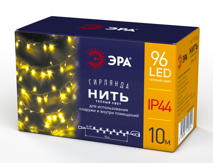Светодиодная 10-метровая гирлянда ЭРА "Нить" (арт. Б0041905) с уютным теплым светом. Универсальный вариант праздничной иллюминации для дома, офиса, общественного пространства, фасада зданий. Защищена от влаги и пыли, морозостойка - с успехом применяется на улице. LED-лампочки не нагреваются даже при длительной непрерывной работе гирлянды. Полупрозрачный повод почти не заметен ЭРА "Нить" хорошо смотрится в интерьере любого стиля. Ровный приятный для глаз свет создают 96 светодиодов последнего поколения. LED-технология экономит до 90% электроэнергии. Эта гирлянда отвечает всем требованиям пожарной безопасности, работает от трансформатора. Есть возможность соединять несколько гирлянд в длинную световую цепь. Трансформатор ЭРА, преобразующий входное напряжение 210-240 В в выходное 24 В: http://www.eraworld.ru/catalog/2647679 (Б0041911). Создавайте праздничное настроение вместе с ЭРА.