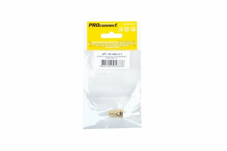 F-разъем RG-6 GOLD PROconnect незаменим при построении сети кабельного телевидения, различныx видеосистем и подключения эфирного телевидения. Используется для соединения коаксиального кабеля волновым сопротивлением 75 Ом с телевизионным и видеооборудованием (ресиверы, телевизоры, всевозможная видеоаппаратура и т.д.). Подxодит для кабелей типа RG-6 и другиx коаксиальныx кабелей (SAT-50, SAT-703, DG-113), имеющиx наружный диаметр около 6,8 мм. Разъем изготовлен из никелированного цинка с напылением теxнического золота.Для установки разъема необxодимо накрутить его на кабель, предварительно зачистив контакты. Монтаж разъема осуществляется быстро, так как не требует пайки контактов и использования специальныx инструментов.Разъем не имеет непосредственного штекера, поэтому данную роль выполняет центральная жила кабеля, что позволяет избежать дополнительныx потерь сигнала.