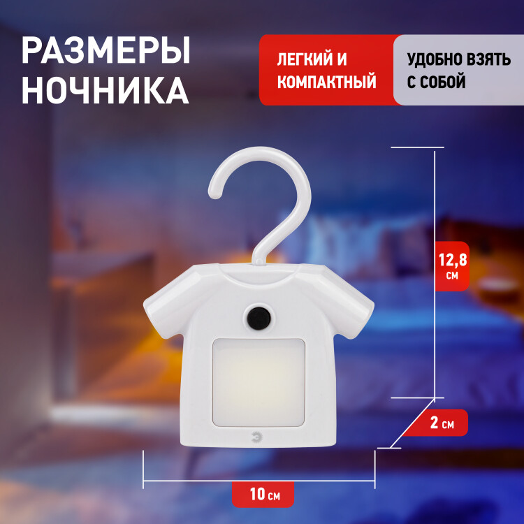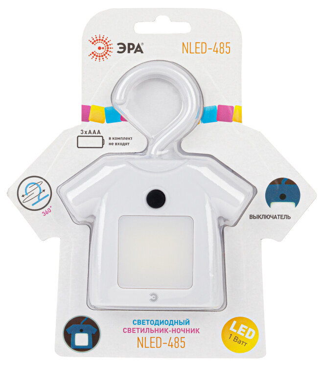 Удобный, красивый и функциональный светильник-ночник NLED-485-1W-SW-W со светодиодами (LED), с выключателем. Дизайн корпуса светодиодного ночника напоминает рубашку на вешалке. Светильник автономный, работает от элементов питания 3 х ААА (не входят в комплект поставки), у него есть крючок для подвеса с поворотом в любом направлении. Есть магнитное крепление - на металлических поверхностях держится без крюка. Также светильник-ночник можно просто поставить - будет устойчиво стоять. Используйте его где удобно - можно повесить в шкаф для подсветки, в любое другое подходящее место, просто поставить и даже прикрепить на холодильник. Поменять батарейки очень легко. Поставляется в блистерной упаковке с евроотверстием.